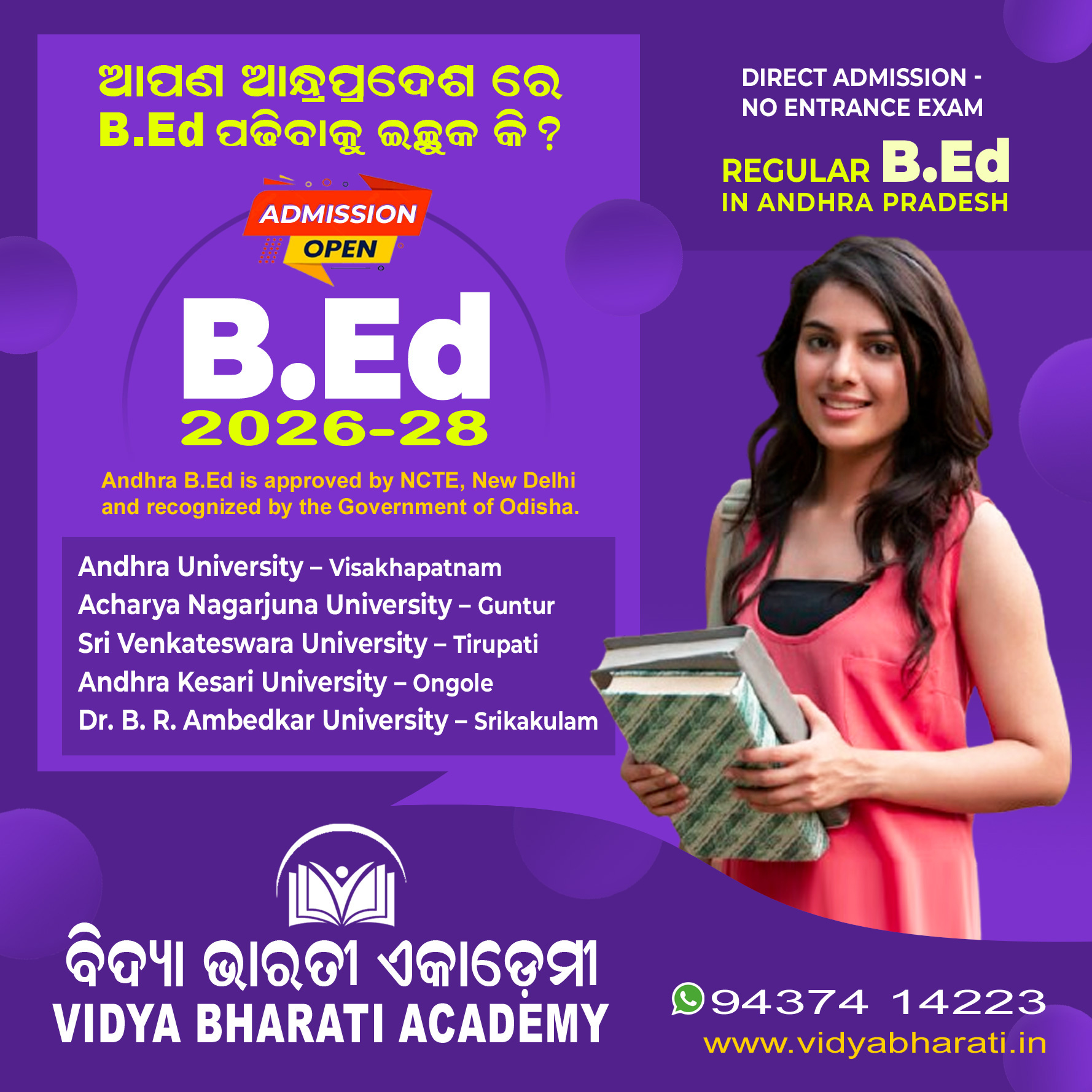 Vidya Bharati Academy stands as the epitome of excellence in education consultancy in Odisha, serving as the premier destination for aspiring B.Ed students. As the top admission consultants for B.Ed in Odisha, we pride ourselves on our comprehensive services, guiding students through every step of the admission process. With our team of experienced professionals, we provide personalized support and expert advice to ensure that each student’s educational journey is smooth and successful. Recognized as both the top education consultants and the premier B.Ed counselling centre in Odisha, we are dedicated to empowering students to achieve their academic goals. Moreover, our expertise extends to students from Andhra Pradesh, as we also operate as a trusted B.Ed counselling centre for those seeking guidance in Odisha. At Vidya Bharati Academy, we are committed to shaping the future of education by nurturing talent and facilitating growth for B.Ed aspirants across Odisha and beyond.